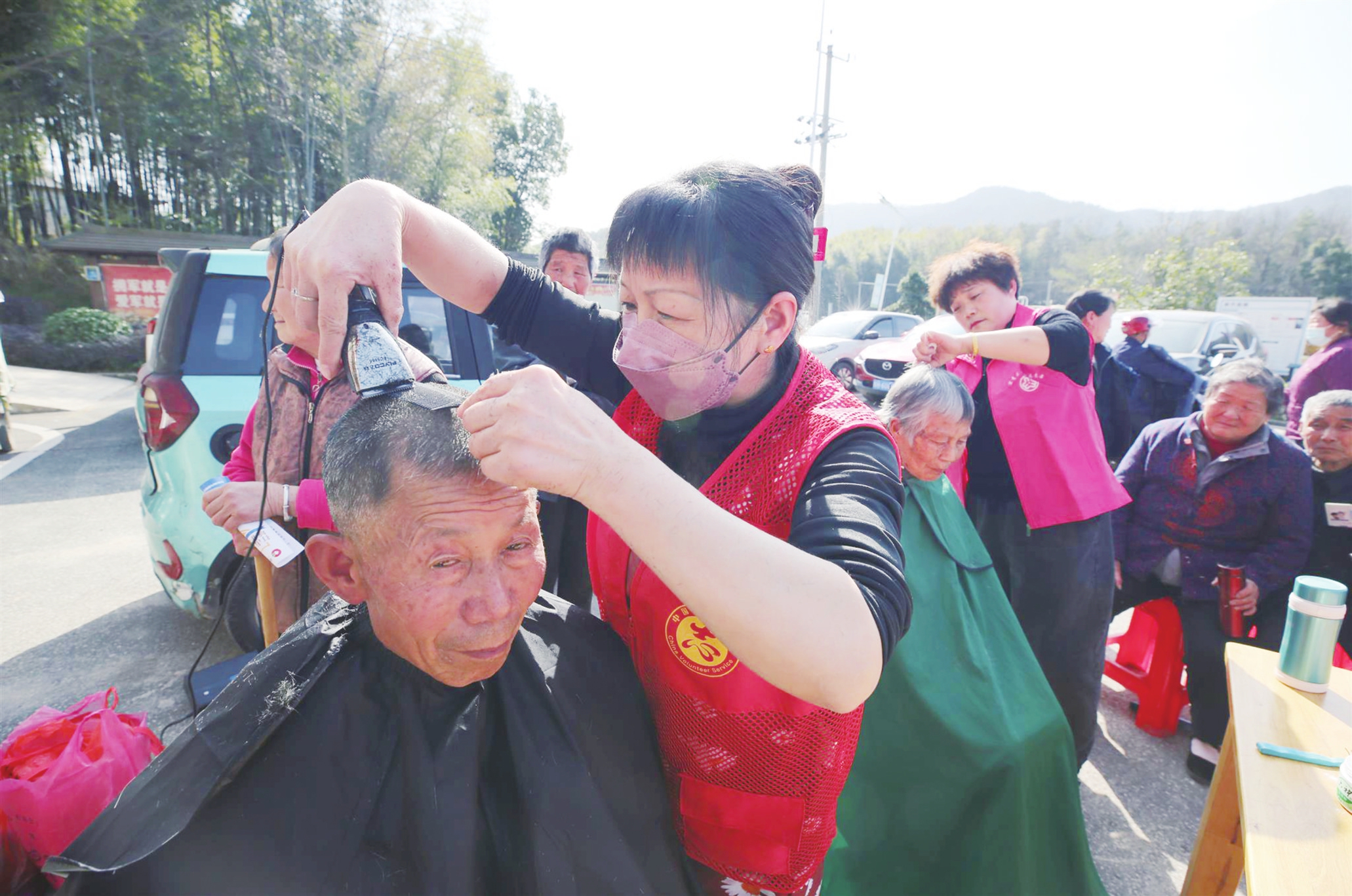 3月21日,志愿者在宜秀区杨桥镇鲍冲湖村为老年人免费理发。