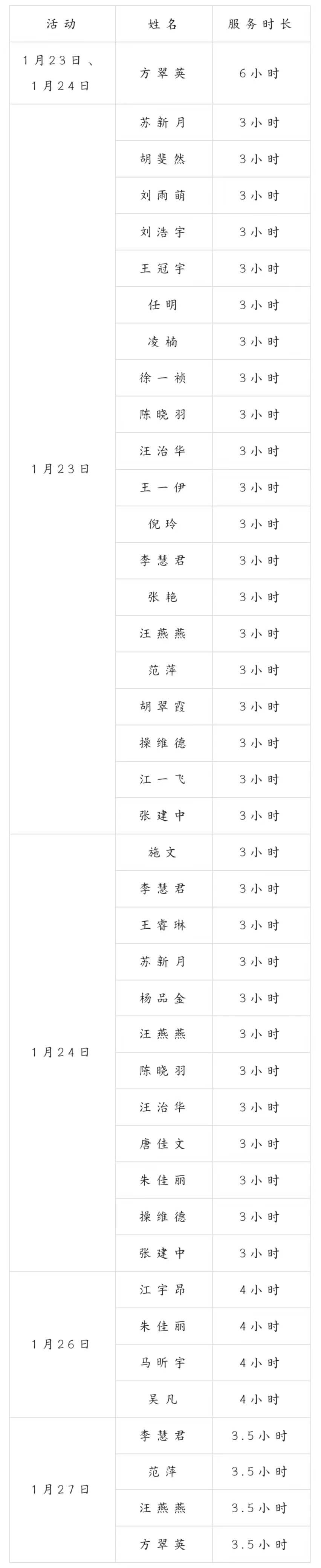 现将参与1月23日、1月24日、1月26日、1月27日志愿服务活动的志愿者的服务时长公示如下,公示时间:2024年1月31日-2024年2月2日。公示期间如有异议,可通过邮件、电话等方式向安庆市志愿服务联合会反映,电子邮箱:aqzyfwlhh@126.com,联系电话:0556-5059623。