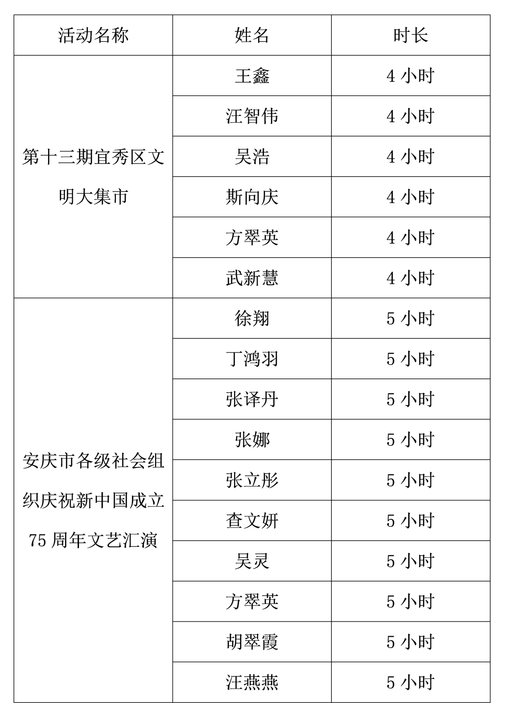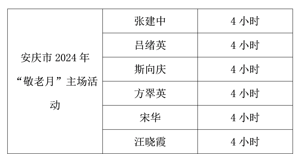 现将参与9月29日第十三期宜秀区文明大集市和安庆市各级社会组织庆祝新中国成立75周年文艺汇演、10月8日安庆市2024年“敬老月”主场活动的志愿者的服务时长公示如下,公示时间:2024年10月8日-2024年10月10日。公示期间如有异议,可通过邮件、电话等方式向安庆市志愿服务联合会反映,电子邮箱:aqzyfwlhh@126.com,联系电话:0556-5059623。
