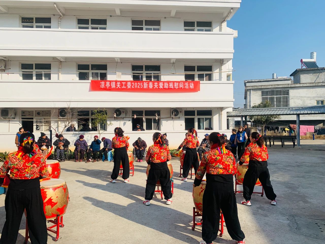 紧接着,由公益协会的表演队带来的精彩节目更是将活动推向了高潮。舞蹈队员们身着鲜艳的服装,伴随着欢快的音乐翩翩起舞,每一个动作都充满了激情与活力,仿佛将春天的气息提前带到了养老院。而锣鼓表演更是震撼人心,激昂的鼓点、响亮的锣声,交织成一曲曲振奋人心的乐章,让在场的每一位观众都沉浸在这份欢乐与喜庆之中。