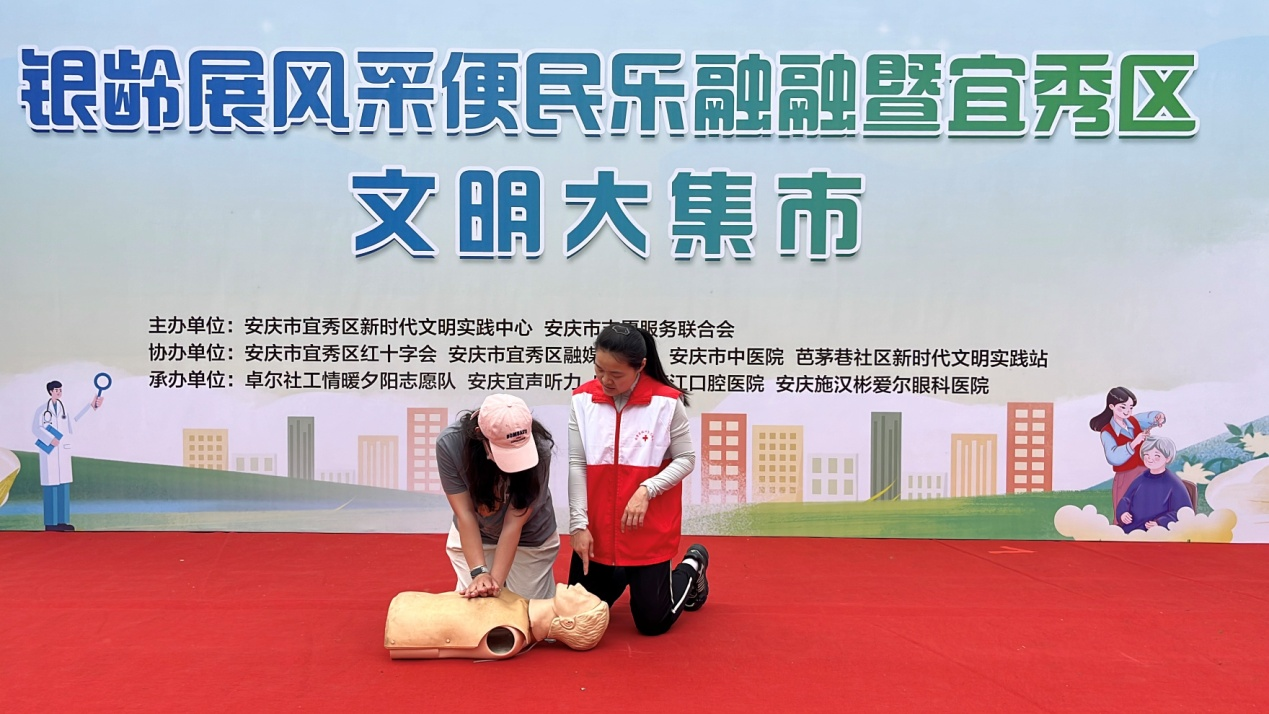 4月23日下午,银龄展风采 便民乐融融文明大集市活动在宜秀区同庆南苑小区广场举行。此次活动由宜秀区新时代文明实践中心、安庆市志愿服务联合会主办,联合宜秀区红十字会、宜秀区融媒体中心、安庆市中医院等9家单位,为居民送上"家门口"的暖心服务。